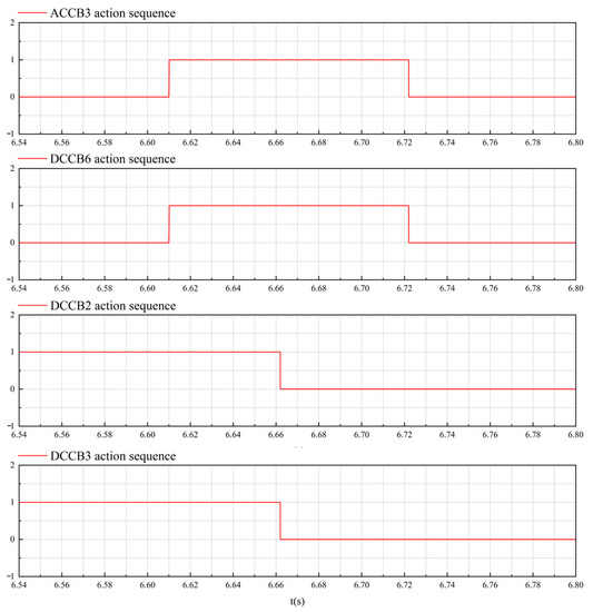 When t = 6.61 s, ACCB3 and DCCB6 were tripped to break the AC line and isolate T3. When t = 6.662 s, DCCB2 and DCCB3 were tripped to isolate T3, T4. Figure 6 shows the action sequence of the AC circuit breaker, DC circuit breaker, and three-port circuit breaker.