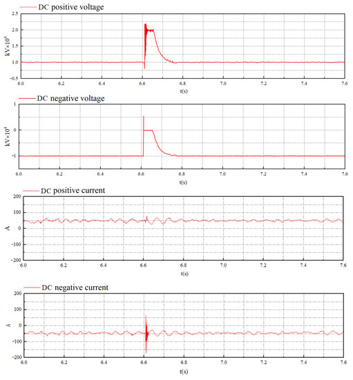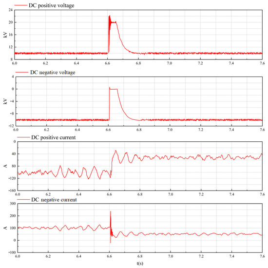 T2 was also affected by T3. The DC positive and negative voltages increased by 10 kV at the same time. After the three-port circuit breaker trips, the T2 voltage returned to the normal level at t = 6.8 s. The positive and negative currents had an evident jitter at 6.615 s, but the steady-state amplitude changed little. Each parameter’s waveform of T2 is shown in Figure 8.
