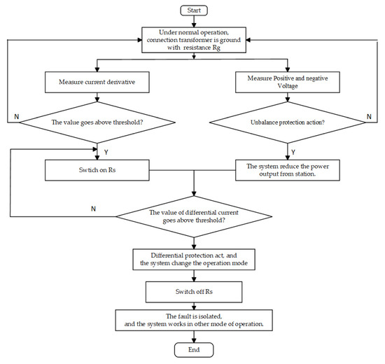 - If voltage unbalance is detected, the system reduces the power output. If the value of current derivative exceeds the threshold, the neutral point grounding small resistance Rs is switched on to increase the fault current rapidly;