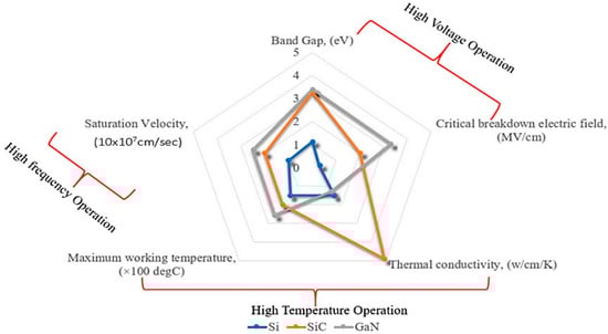 Comparison between silicon (Si), silicon carbide (SiC), and gallium nitride (GaN) [73].