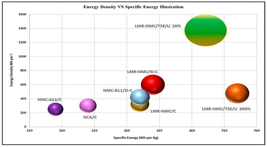 According to the cathode material utilized, Li-ion batteries are frequently categorized [80,81]. The common iron and phosphate are used to create LFP (lithium iron phosphate) batteries, on the other hand. Due to the material’s hard olivine structure, these batteries have a very long lifespan and are capable of producing very high power. Unfortunately, this technology’s intrinsic low potential compared to Li+ and particular capacitance make it less suitable for high-energy applications. LFP is still a good option for power applications (hybrid cars, power equipment, etc.) or situations requiring a lot of cycles, whereas both lithium nickel cobalt aluminum oxide (NCA) and lithium nickel manganese cobalt oxide (NMC) are energy-dense technologies, and electric cars frequently employ them. The amount of cobalt is being decreased in favor of the amount of nickel in both technologies, which is a definite trend. This guarantees a better energy density and lessens reliance on pricey cobalt. Studying different stoichiometric proportions enables us to see several types of NMC which are now available for commercial usage. Considering NMC111, NMC532, and NMC622, each of the three components are present in the same quantity. NMC111 is better suited for higher power applications, since it has less nickel and more manganese, but NCA, NMC-532, and NMC-622 are considered to be cutting-edge cathode materials, as seen in Figure 3.