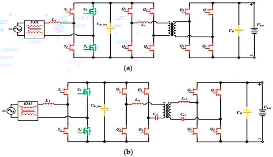 For opting for the off-board charger in the power electronic converter there are a few main factors that must be studied, such as high reliability, distortion-free operation, less grid interference, lower system size, weight, high efficiency, and, last but certainly not least, high efficiency. In order to be portable, light, and effective, wide band gap devices have contributed a lot, and they made switching frequency optimal as required in this domain by low gate charge and output capacitance. This was possible all because of the GaN-based power transistors. The devices such as capacitors, inductors, and transformers, which are passive in nature, were also changed to be lighter weight and smaller in size [107,108] because of the advent of WBG technology. It is noted that GaN-based transistors are high electron mobility transistors (HEMT), thus we call them GaN-HEMT in short, and they have a voltage rating up to 660 V, whereas the current ranges from 20–50 A [104,107]. These components are mostly deployed in off-board chargers (OBCs) with the output power ranging in between 3.0 kW and 20 kW. Figure 6 is illustrated in order to show two single-phase bidirectional off-board chargers with a special DC to DC stage structure as well as the same identical AC to DC structure, which is a totem pole PFC. One may also see the dual active bridge that is functional because of the galvanic-nature-based isolation and bidirectional power transformation, including zero-voltage detector and switching at both primary as well as secondary sides. This has compact-size-based components and a fixed-frequency operation, as referred to in [109].