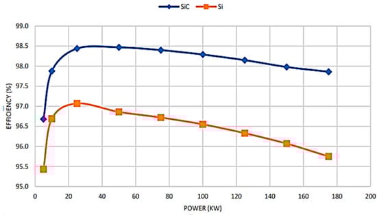 Four AFE converters are combined and connected in parallel to generate the current design, which is suggested for the 600 kW DC ultra-fast charger [111]. This is seen in Figure 7. A comparison of silicon-based and silicon-carbide-based semiconductors has been performed for each module with a 150 kW power rating. In order to examine the effectiveness of Si (SKM400GB12T4) and SiC (CAS300M12BM2) devices at various power levels, a non-linear electro-thermal simulation model was adopted. The simulations for both scenarios contain the pertinent datasheet information. Figure 8 illustrates how SiC devices are substantially more effective as chargers than silicon-based ones. Wide band gap devices can save energy in this way because Si has a larger loss than SiC.