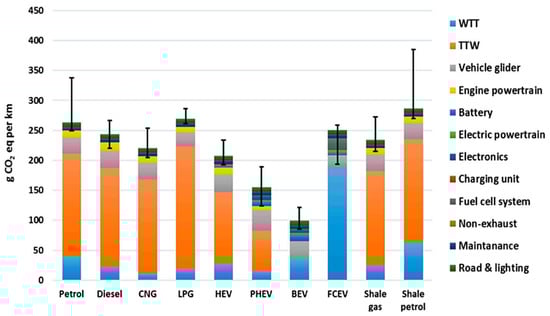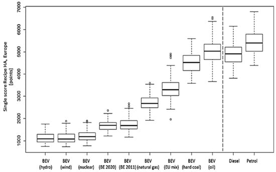 In light of this, reference [120] suggests a range-based LCA method that takes into account the market variability of each technology. The results reveal that, as shown in Figure 10, the BEV performs best when evaluated on an all-encompassing single score level.