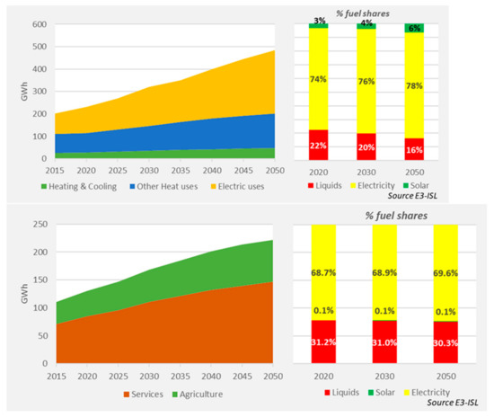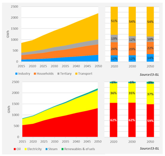 The final energy demand in the tertiary sector increases (Figure 3), following the growth of sectoral value added; however, after 2035, a gradual decoupling from economic activity is projected due to the delivery of less energy-intensive, high-value-added activities and the deployment of more efficient technologies. The fuel mix in the tertiary sector presents no major differences in the 2020–2050 period, except for a slight increase in the electricity share to the detriment of liquids.