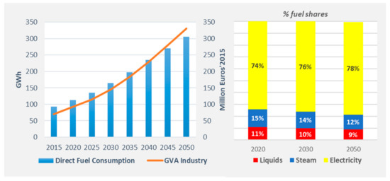 Baseline scenario—fuel consumption rates in manufacturing vs. gross value added and the evolution of fuel mix in the industry for the period 2020–2050; source: E3-ISL.