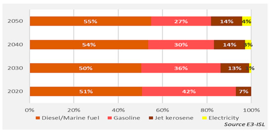 Baseline scenario—evolution of fuel mix in transport over 2020–2050.