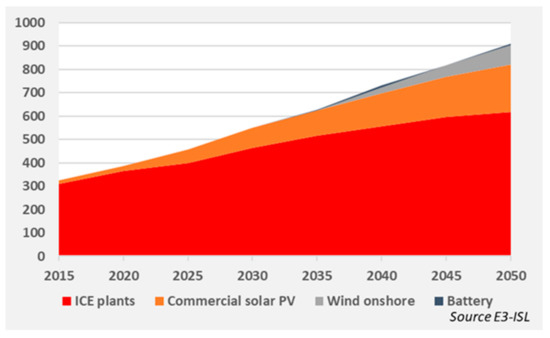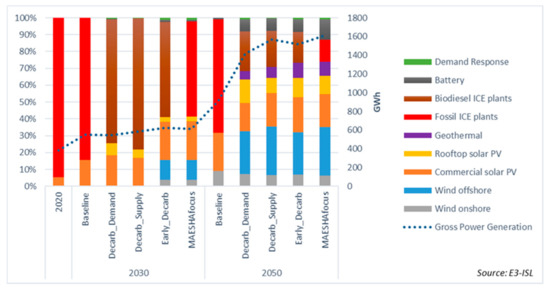 The E3-ISL model accounts for all present and candidate power plants in Mayotte, based on the input provided by local stakeholders and EDM. The Baseline scenario considers that the four older units, G01–G04, of the Badamiers plant were decommissioned before 2020, while the units G05–G08 of Badamiers will be decommissioned by 2023; however, no other plant decommissioning activity is scheduled for Longoni I and II, and Badamiers G21–24 will operate until 2050. The Baseline scenario also assumes the installation of 11.5 MW of battery storage by 2025 and the rational utilization of Longoni and Badamiers (at present, the units are operating for 2000–3000 h/year). The scenario also considers that solar PV plants that have already acquired a license to operate (reaching a total capacity of 36.6 MW) will be connected to the grid by 2030. Based on the experience of EDM on the development of PV projects in Mayotte, minor delays are projected in the Baseline scenario. The further penetration of RESs is stimulated by the market trends, their decreasing costs, and the increasing carbon price.