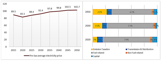 Electricity prices in Mayotte are not cost-reflective and insufficient to recover the overall generation, transmission, and distribution costs. The power sector is greatly subsidized by the mainland (France), and (in the absence of specific legislation) we assume that this will be sustained in the future. The pre-tax electricity price is projected to recover in the short term from low levels in 2020, propelled by rapid economic recovery, then to gradually increase in the mid-term, tending to stabilize in the long term due to the accelerated deployment of RESs combined with their decreasing RES technology costs. The latter mitigates the impact of a high carbon price after 2030. The fuel-related cost accounts for most of the electricity tariff in 2020–2050; however, this share will decrease over time (from 74% in 2020 to 63% in 2050, Figure 6). On the other hand, the share of capital costs and emission taxation will increase due to new capacity investments (primarily in solar PV and wind) and grid expansions, as well as the increasing carbon price.