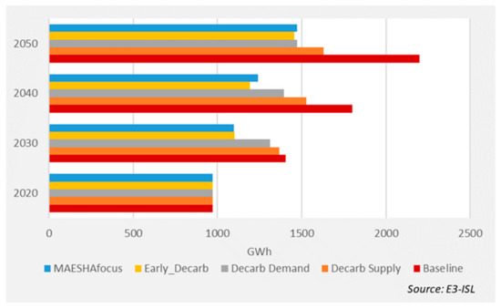 Relative to the energy supply, all decarbonization scenarios require increased power capacities compared to the baseline levels, mainly driven by the almost full electrification of transport and increased demand for green hydrogen and synthetic e-fuels, which represent a considerable share of the gross electricity demand by 2050, especially in the Decarb_Supply scenario. This increase implies significant capital investments in the electricity sector, especially for renewable energy sources (RESs) and storage development. The accelerated climate effort in the Early_Decarb and MAESHAfocus scenarios implies a considerable RES share in the electricity mix, even in 2030, through the rapid uptake of solar PV and wind, as well as the early electrification of the transport sector.