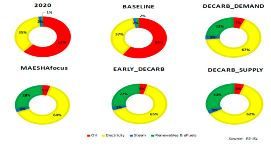 Oil products are projected to continue dominating energy consumption with only a small decline in their share from 62% at present to 59% in 2050 (Figure 1). The Baseline scenario leads to a slight shift in the fuel mix from oil to electricity and RESs, including the use of solar water heaters in buildings [28]. By 2050, the share of electricity will increase due to the moderate market uptake of electric cars that allow for the substitution (to a limited extent) of oil products in transportation. The increasing use of electricity in buildings also contributes to an increased electricity share.
