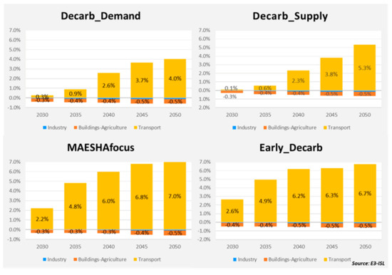 The Early_decarbonisation and MAESHAfocus scenarios are characterized by rapid transformations and present a sharp decline in final energy consumption compared to the Baseline scenario, from 2025 onwards. Furthermore, these two scenarios show the best performance in terms of energy consumption for the transport sector, as they both assume that the decarbonization of this sector will be finalized in 2040–2045.