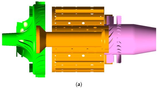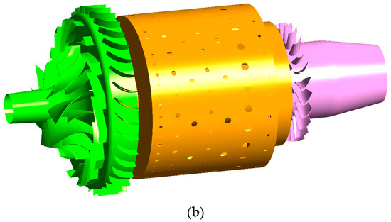 Three-dimensional CAD model of the micro-gas turbine: (a) cross-section view; (b) whole view.