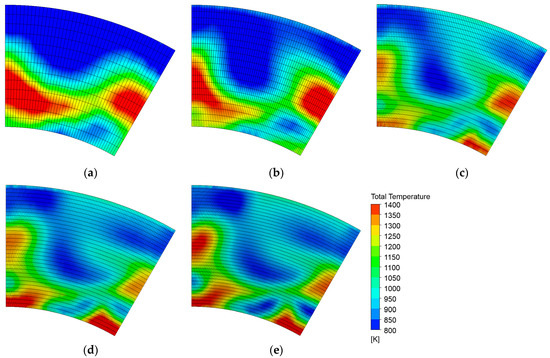 Combustor outlet total temperature contour of different mesh size configuration: (a) 0.8 M; (b) 2.1 M; (c) 3.3 M; (d) 4.5 M; (e) 6.2 M.