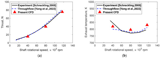 In this section, the simulation method is validated using data from the public domain, including experiments by Schreckling [42] and numerical throughflow simulations by Yang et al. [44]. Two parameters, engine thrust and exhaust temperature, are compared. Figure 5 displays the validation results for engine thrust and exhaust temperature. The chosen operating point in the current work, at maximum thrust around 120,000 rpm, is slightly under-predicted for thrust and slightly over-predicted for exhaust temperature, but both are close to the expected results. A detailed analysis of the whole engine model is not the focus of this study and is presented in a separate report. The validation results confirm the validity of the CFD simulation approach used in this study. Further validations for the turbomachinery gas path for popular test geometries have been carried out using the same code and simulation method. However, they are not shown in the present work and will be released in future works that involved turbomachinery components.