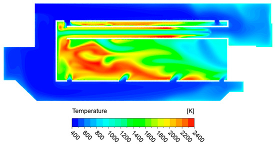 Figure 7 shows the streamwise temperature contour at the cross-section surface of the combustion chamber. The flame can reach up to 2400–2600 Kelvin degrees at the chamber core. It is interesting to note that the flame has the tendency to move downward, which would interact with the lower inner combustor casing. Thus, this part of the combustion chamber is prone to overheating if the cooling system is not designed properly.