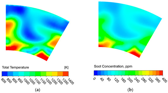 Figure 8a,b show the total temperature and the soot concentration at the combustor outlet, respectively. A hot-spot can be seen at mid-span (Figure 8a), which is responsible for the hot streak that travels downstream to the turbine stage and reduces the nozzle guide vane’s lifetime. In this micro-gas turbine model, there is also an end-wall hot-spot. Like the mid-span hot spot, it can overheat the turbine hub casing, reducing the performance and lifetime of the micro-gas turbine system. The soot concentration contour (Figure 8b) has a similar spatial distribution compared with the total temperature contour (Figure 8a), confirming that soot formation is highly correlated with the local temperature field.