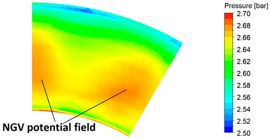 In this section, the impact of outlet boundary conditions on the micro-gas turbine combustor is analyzed. The baseline configuration uses a uniform outlet static pressure boundary condition, which corresponds to the average value obtained from the whole engine model analysis. However, the presence of downstream nozzle guide vanes (NGVs) creates a pressure field upstream that affects the combustor simulation domain. Figure 9 displays the pressure contour at the combustor–turbine interface in the fully coupled simulation model, showing an increase in pressure in certain circumferential and radial locations corresponding to the potential field of the turbine vanes. The results from the baseline configuration with uniform outlet pressure are compared with those obtained from the simulation with the non-uniform outlet pressure boundary condition.
