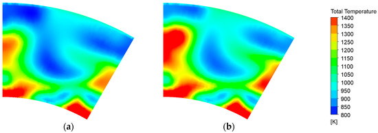 Figure 10 shows the contour of the total temperature at the combustor outlet under uniform (Figure 10a) and non-uniform (Figure 10b) outlet pressure boundary conditions. Both simulations exhibit similar spatial distributions, featuring mid-span and end-wall hot-spots. However, the non-uniform outlet simulation predicts a higher temperature at the combustor outlet, reflecting the zones with increased static pressure as seen in Figure 9. This aligns with the ideal gas law, which states that pressure levels are proportional to temperature.