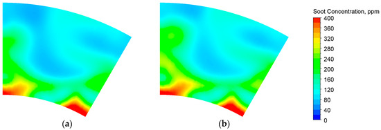Figure 12 shows the contour of the soot concentration at the combustor outlet under uniform (Figure 12a) and non-uniform (Figure 12b) outlet pressure boundary conditions. The general spatial distribution is similar among the two simulations. The soot concentration (Figure 12) is highly correlated to the total temperature shown in Figure 11.