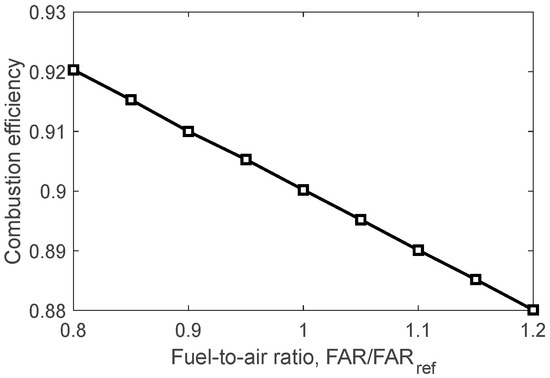 In fact, the fuel-to-air ratio is not an explicit control parameter. Depending on the operating point of the engine, a specific fuel mass flow rate is consumed corresponding to a given shaft rotational speed. Thus, the fuel mass flow rate is typically an unknown, and is calculated iteratively to match the compressor power and the turbine power for a given shaft rotational speed. As is common practice, for example, in Briones at el. [46], the fuel mass flow rate was calculated using the secant root-finding method:
