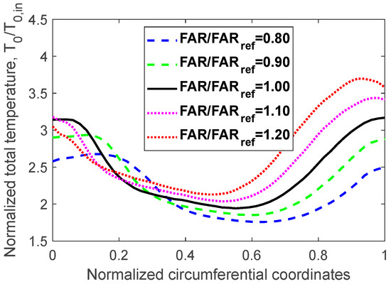 Because the combustion efficiency is strongly related to the total temperature values, we next analyze the total temperature distribution pattern. Figure 15 shows the circumferential distribution of the total temperature at the mid-span of the combustor outlet for different fuel-to-air ratios, which characterize the mid-span hot-spot. Changes in the fuel-to-air ratio significantly affect not only the level of the outlet temperature but also its pattern. As the fuel-to-air ratio decreases, both the peak and trough temperature decrease, indicating a reduction in the severity of the hot-spot at the combustor–turbine interface. Notably, the relative circumferential location of the peak and trough total temperature also change. It should be noted that the combustor and nozzle guide vane circumferential locations remain fixed for all investigations.