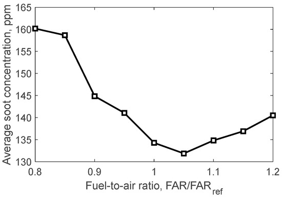 Figure 16 shows the average soot concentration at the combustor outlet for different values of fuel-to-air ratio. This time a non-monotonic relationship is observed. The optimum value of fuel-to-air ratio in terms of soot emissions is around 1.05, slightly larger than the baseline value in the current study. For fuel-to-air ratio values smaller or larger than this optimum value, the amount of soot emissions increase. Decreasing the fuel-to-air ratio tends to have a higher rate of soot formation.