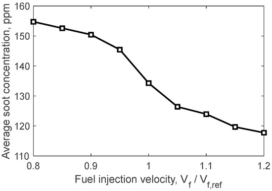 Figure 19 shows the average soot concentration for different values of fuel injection velocity. Although a non-linear pattern is observed, the trend is monotonic. As the fuel injection velocity decreases, the average soot concentration consistently increases. However, the rate of increasing is highest near the baseline value. Further away from the baseline injection velocity, the average soot concentration changes moderately. This trend can be partly explained by the fuel residence time. As the fuel injection velocity decreases, the fuel particles stay longer in the combustion zone, leading to a higher soot concentration.