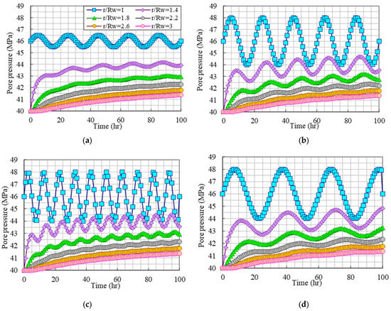 Variation of pore pressure over time at different locations around the well under pressure variations. (a) Amplitude 0.5 MPa, period 20 h; (b) Amplitude 2 MPa, period 20 h; (c) Amplitude 2 MPa, period 10 h; (d) Amplitude 2 MPa, period 30 h.
