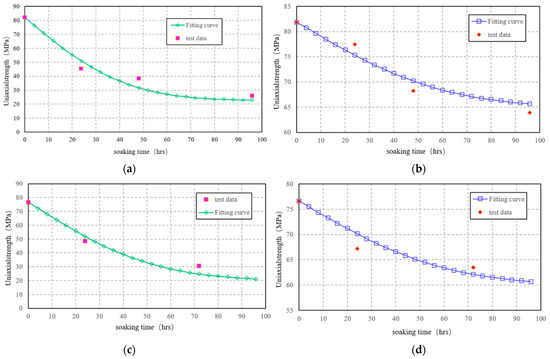 The variation of mud shale strength of Well A and Well B with different drilling fluids and soaking times. (a) Well A, water-based drilling fluid; (b) Well A, oil-based drilling fluid; (c) Well B, water-based drilling fluid; (d) Well B, oil-based drilling fluid.