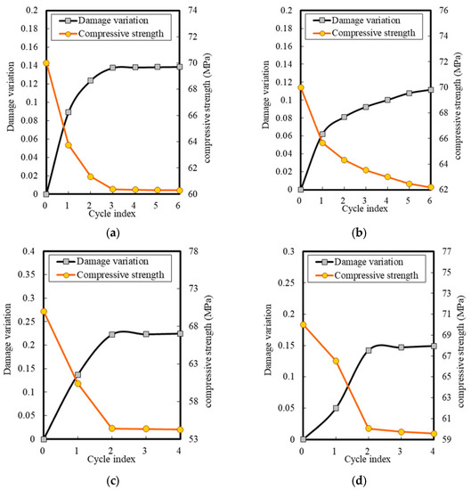 Variation of damage variable and rock compressive strength under cyclic loading. (a) 1# core; (b) 2# core; (c) 3# core; (d) 4# core.