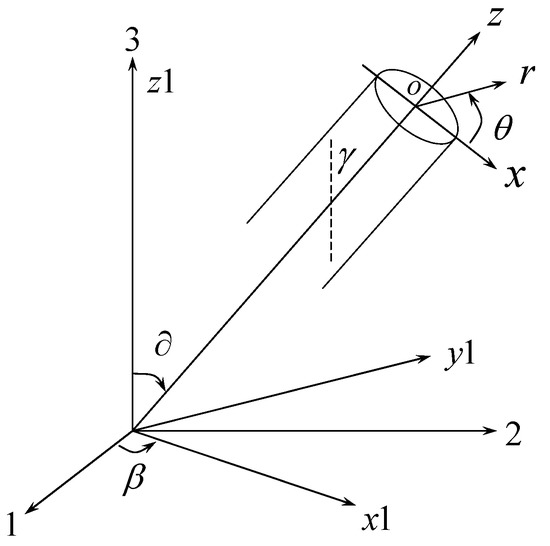 According to the elastic mechanic theory of porous media, concentrated stress is induced surrounding the borehole due to stress redistribution after wells were drilled. Various authors have addressed methods for calculating the concentrated stress state under the effect of in situ ground stress and bottom hole pressure [23,24,25]. Many wells being drilled for oil and gas production are either horizontal, highly deviated from vertical or have complex trajectories, and for an arbitrarily deviated well, the principal stresses acting in the vicinity of the wellbore wall are generally not aligned with the wellbore axis, so the stress state surrounding an arbitrarily deviated well should be calculated through coordinate system transformation. At first, the in situ ground stress should be transformed from the geodetic coordinate systems (1, 2, 3) to the borehole coordinate system (x, y, z), and the coordinate conversion is presented in Figure 4.