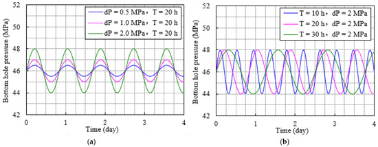 Simulation waveform graph for wellbore bottom pressure variation. (a) Constant period of fluctuation; (b) Constant amplitude of fluctuation.