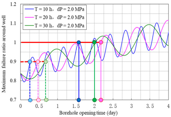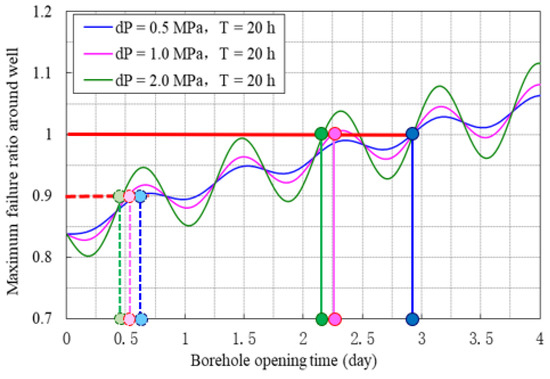 - When the period of pressure fluctuation at the bottom of the well is certain, the greater the fluctuation range, and the faster the maximum failure ratio of the formation around the borehole increases, the shorter the corresponding borehole drilling open time. When the maximum failure ratio of the formation around the borehole reaches 0.9 and 1, the shorter the period of wellbore stability;