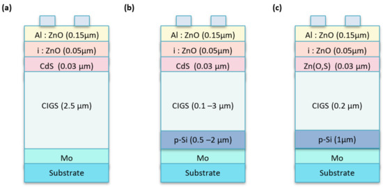 Currently, cadmium sulfide (CdS) is used as a buffer layer in most of the CIGS-based solar cells [30]. However, cadmium is toxic and harmful to the environment [12,30]. Furthermore, the bandgap of CdS is about 2.4 eV [31], which is not large enough to transmit all the parts of visible light and limits the further enhancement of light-to-electricity conversion efficiency. A. Chadel et al., in ref. [32], showed that the solar cell based on CIGS/Zn(O1−x,Sx) attains an electrical performance equivalent to the solar cell based on CIGS/CdS. Oxysulfide of zinc (Zn(O,S)) is not toxic, it has a band gap energy (Eg) ranging from 2.7 eV to 3.6 eV [33], and it is deposited on the CIGS with the co-sputtering PVD, which is less expensive than chemical bath deposition. Thus, it is interesting to envisage the replacement of CdS in the buffer layer by Zn(O,S). This new structure with a Zn(O,S) buffer layer as shown in Figure 1c.