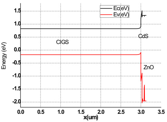 The band diagrams for the structures of CIGS/CdS/i:ZnO/Al:ZnO and Si/CIGS/CdS/i:ZnO/Al:ZnO solar cells are represented in Figure 2 and Figure 3, respectively. We simulated these energy bands using SCAPS. Energy band diagrams help in explaining the properties of both photovoltaic cells. We observed that there was a good band alignment between the Si and the CIGS absorber layers. It should be noted that the defect is taken into account in each layer, as well as in the interface between Cu(In0.7,Ga0.3)Se2 and Si.