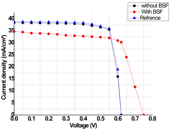 The recombination of electrons at the back contact is due to the depletion region being very close to the back contact. Furthermore, the CIGS/Mo interface has a high recombination velocity [40] which improves the electron-catching process during cell operation. To increase the efficiency of the ultra-thin CIGS solar cells, the carrier recombination at the back surface must be reduced. One of the practical ways is to introduce a back surface field (BSF). Moreover, this layer decreases the back contact barrier height and reduces minority carrier recombination loss [41,42]. The influence of the thickness of the CIGS absorber layer on the performance of the proposed cell with BSF is shown in Figure 5. By incorporating the BSF layer, when the absorber layer increases from 0.1 to 3 µm, the JSC increases from 28.65 to 38.89 mA/cm2, and VOC decreases slightly from 0.776 V to 0.65 V. The Si BSF layer reduces carrier recombination losses and improves carrier movement due to migration. This phenomenon leads to an increase in the short-circuit current and a drop in the open-circuit voltage. The decrease in the open-circuit voltage is explained by the existence of the leakage current or diode current. Thus, it can be seen that the open-circuit voltage follows the same variation as the fill factor. This effect was also previously confirmed by the relationship between FF and VOC as shown in the examples defined in Todorov et al. [43] and Green [44]. Finally, the cell efficiency increases rapidly when the Si layer is fused to act as a BSF layer (1020 cm−3 doping) adjacent to the CIGS absorber layer (2 × 1016 cm−3 doping). The interface between p+-type Si and p-type CIGS acts as a p–n junction. The electric field thus created acts as a barrier to the flow of minority carriers towards the rear surface. The simulation results show that a 0.2 µm thick CIGS layer can be considered as optimal, a value which will be applied in the rest of the study. This result is confirmed by Duchatelet et al. [45], who showed that an absorber layer thickness of 0.3 to 0.7 µm is sufficient to absorb almost all of the incident solar radiation due to the direct band gap and the materials related to chalcopyrite. This small discard of 0.1 is the difference between the simulations and the experiment, and it confirms that we are not far from the theory.