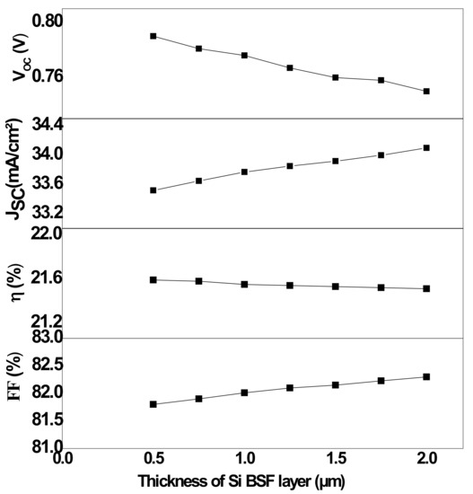 Figure 6 shows the performance of the solar cell with BSF according to the thickness of the BSF Layer (Si). The thickness of the BSF layer was changed from 0.5 µm to 2 µm while all the remaining parameters of the solar cell were kept constant. Simulated fallouts show that, with an increase in the thickness of the BSF layer, a very small variation is observed in the functional parameters, i.e., in JSC, VOC, η, and FF, such as the efficiency η, which decreases from 21.53% to 21.45%. This result shows that an increase in BSF layer thickness does not affect the output of the proposed device. In the design of Si/CIGS solar cells, the optimum thickness of the BSF layer is 1 µm.