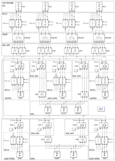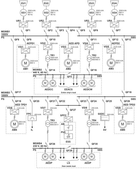 The basis of the SEPS in Figure 1 consists of DC bus systems MSWB1,3 with a nominal voltage of V and AC MSWB2,4 with linear nominal voltages of V and V. The power supply in the ship’s power plant is four synchronous generators (SG1-4) with an installed full nominal power of kVA. The linear nominal voltage of each generator is V.