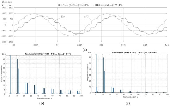 The analysis of the modeling results for the EPQ assessment in SEPSs (Figure 1) revealed that in all considered modes 1–4, the linear voltage and current SG1-4, and (Figure 5a), are non-sinusoidal (, , respectively) as a result of the impact of PSC SP1 (UR1-4) (Figure 1 and Figure 2) on the spectra of and , respectively.