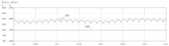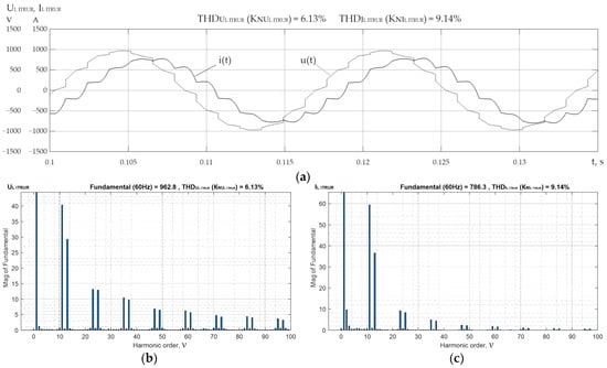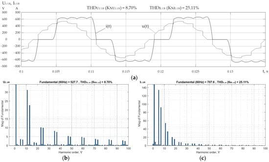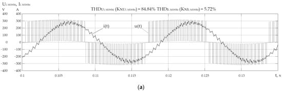 From Figure 5a–c and Table 6 (for all modes), it is obvious that the values of and are lower than the values of and , respectively, at the inputs of UR1-4, which in turn are in the ranges of and , respectively. This fact is explained by the effect of the inductance of three-winding power transformers UR1-4 with resistance on the reduction in harmonics generated in the network by uncontrolled rectifiers and with the orders , where is the pulse rate of the rectifier and . Figure 7a shows the current , consumed by UR1-4, which has a form corresponding to the presence of a significant capacity in the load. In this case, these are the capacitors at the input of VSI1-4 with PWM . The shape of the voltage on MSWB2 (Figure 9a) is determined by the output voltage of VSI2,4 with PWM (for the modes 1–4 ). At the same time, the form of the current MSWB2 (Figure 9a) is near to sinusoidal due to the significant inductance in the transformers TR1,2 with the inductive resistances .