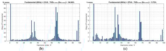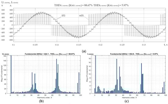 Waveforms of linear voltage and current of MSWB4 (a), amplitude spectra of harmonics of linear voltage (b) and current (c) of MSWB4 in mode 1.