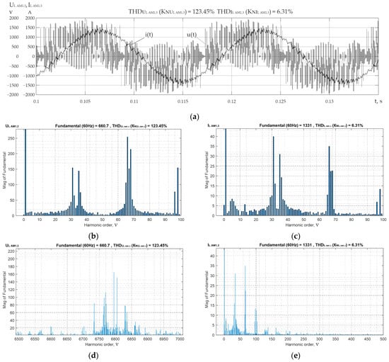 Waveforms of linear voltage and current of AM1,3 as part of AGED (a); amplitude spectra of harmonics of linear voltage (b,d) and current (c,e), respectively, in the LFA and HFA of the AM1,3 AGED region in mode 1.