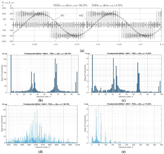 Waveforms of linear voltage and current of AM2 as part of AGED (a); amplitude spectra of harmonics of linear voltage (b,d) and current (c,e), respectively, in the LFA and HFA of the AM2 AGED region in mode 1.