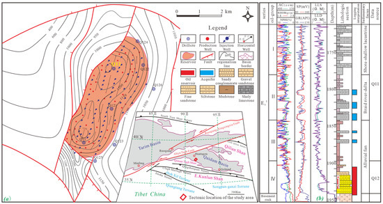(a) Tectonic location of the research area, which is marked with a red box, is the west block of the Kunbei thrust structural belt. (b) Diagram showing the composite columnar of the reservoir, where oil layers are concentrated at the bottom of the target stratum. There are six lithofacies and two types of logging interpretation conclusions along the target stratum.