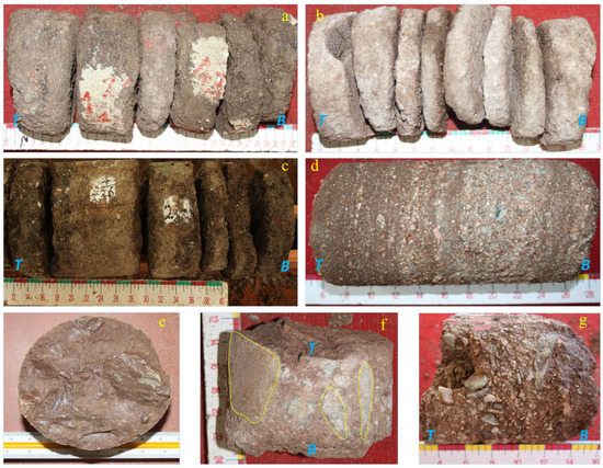 Typical sedimentary structures charts found in the Qie12 block: (a) Q12−10−8, 2059.1 m, tabular crossbedding; (b) Q12−7−28, 1829.4 m, tabular crossbedding; (c) Q12p1, 1809 m, tabular crossbedding; (d) Q125, 2026.5 m, trough crossbedding, gravel orientation arrangement; (e) Q12−23−6, 1917 m, massive bedding, gravel upright; (f) Q12−7−28, 1842.4 m, massive bedding, gravel upright; and (g) Q121, 1842.7 m, massive bedding. T is the top surface, and B is the bottom surface of the core in these figures.