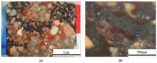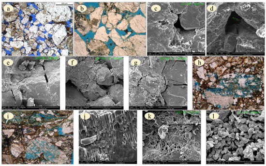 In this study area, reservoir petrology is characterized by low compositional and structural maturity. The compositional maturity index (Q/(F + R)) is 0.23. The reservoir is poorly sorted, and the main contact method among its particles is the line–point contact relationship. The average mass fraction of its mud base is approximately 8.4%, and its average cement content of 2.1% is relatively low. We utilized various experimental techniques, including thin-section observation, scanning electron microscopy (SEM), mercury injection, and computed tomography (CT) scanning, and their results confirmed the dual porosity media characteristics of the space-type sandy conglomerates in this study area [25,26]. Four types of pores were found in the reservoir: primary intergranular (Figure 3a–d), intragranular dissolution (Figure 3h–j), diagenetic fracture (Figure 3e–g) [27], and argillaceous micropores (Figure 3k,l), and the proportion of primary intergranular pores is >60%. In this study, the diagenesis affecting the sand conglomerate reservoir includes compaction, cementation, and dissolution [28]. Compaction is the main diagenesis to reduce the primary intergranular pores, the average compaction pore reduction and compaction pore reduction rates are 19% and 53%, respectively. The compaction intensity is medium. Additionally, the diagenetic fractures developed due to compaction increased the reservoir pore space and partially improved the reservoir’s permeability; this had a certain constructive effect on the reservoir transformation. Cementation is another important factor contributing to the reduction of the primary intergranular pores, with a pore reduction of 3% and a pore reduction rate of 8%. Calcite, anhydrite, and dolomite are mostly distributed in porphyry pores; moreover, they are only partially enriched in the unconformity surface between the sand conglomerate and the basement rock. Dissolution plays a constructive role in modifying reservoir performance. In this study, dissolution either selectively dissolved feldspar and igneous rock debris to form intragranular pores or spread along diagenetic fractures to create dissolution pores. The dissolution pore enhancement and dissolution pore enhancement rates are 2% and 5%, respectively.
