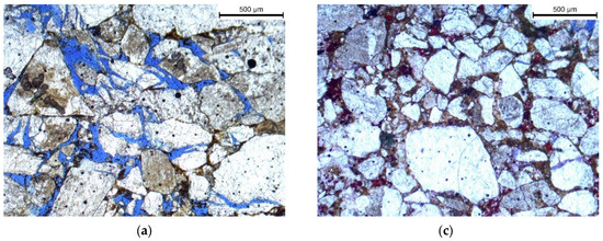 The microheterogeneity of the reservoir is mainly due to various pore structures, which are formed by different sedimentary fabrics [29,30]. Under the same geological background and identical dynamic diagenetic conditions within the reservoir, the grain sizes and cement contents of different sedimentary microfacies are the same. The mud content is the most intuitive reflection that describes the differences in control sedimentary fabrics found in various facies belts of alluvial fans. The high or low contents of the mud controlled the pore structure of the reservoir, and it also determines the strength of the reservoir’s microheterogeneity. SEM images of thin sections and particle size data showed two types of pore structures in the reservoir of this study area; furthermore, these structures are bimodal and multimodal.