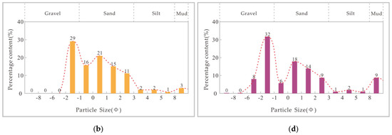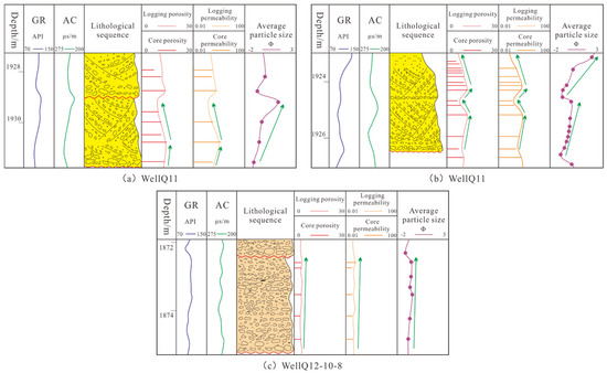 Based on the data obtained from the core physical property analysis, the permeability rhythmic characteristics of the single sand body in this study area have two rhythm types: compound and homogeneous. The former is a typical characteristic of the sand body in the braided channel. The median grain size of sands in the sand body shows positive and compound positive rhythms, and the wellbore logging curve characteristics show bell and box shapes. WellQ11, with a depth range of 1929–1932 m, has a typical permeability compound rhythm that is composed of a single-granularity positive rhythm (Figure 5a). The bottom of a rhythm is controlled by hydrodynamic conditions, and it has coarse grains that are mainly composed of gravel with poorly sorted sedimentary fabric and poor permeability. In the middle section of the rhythm, the hydrodynamic energy is moderate, and the sand is mainly coarse-medium in grain size and well-sorted with low mud content and good permeability. In the upper section of the rhythm, the channel energy is attenuated, which turns the grain sizes to fine (mainly fine-silty sand), and the fabric sorting is medium. The mud content in this section is high, and its permeability is poor. Its permeability rush coefficient and ratio are 3.3 and 126, respectively. Finally, this section has strong heterogeneity.