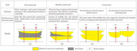 Through a good correlation comparison of effective sand bodies with interlayers in this study area, we concluded the presence of four sand body connectivity mode types: disconnected, weakly connected, connected multilayer, and connected multilateral type, which are shown in Figure 8a–d, respectively. The disconnected, weakly connected, and two-connected types account for 20%, 35%, and 45% of the total, respectively. The disconnected type mainly develops in the extensively connected body unit sandwiched with intermittent channels. The weakly connected type develops mainly in the lateral alternated unit with braided channel and sheet flow sediment. Meanwhile, the connected types mainly develop in the composite channel unit formed by overlapping and separated stable channels, and they play an important role in controlling water injection and well pattern arrangement.